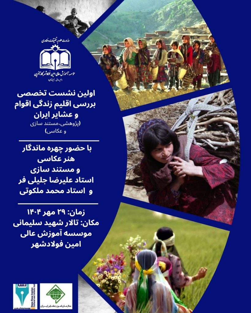 اولین نشست تخصصی بررسی اقلیم زندگی اقوام و عشایر ایران با حضور چهره ماندگار هنر عکاسی و مستند سازی استاد علیرضا جلیلی فر و استاد محمد ملکوتی زمان: ۲۹ مهر ۱۴۰۴ ساعت ۱۰ تا ۱۲ مکان: تالار شهید سلیمانی موسسه ادامه مطلب